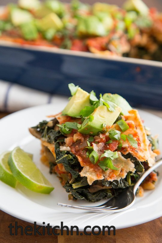 This vegan weeknight meal combines everything you love about enchiladas — the savory filling, corn tortillas, and bright salsa — with the ease and comfort of a casserole. Instead of typical rolled enchiladas, we spread the warm kale-and-mushroom filling between layers of corn tortillas. Think of it like an enchilada lasagna.